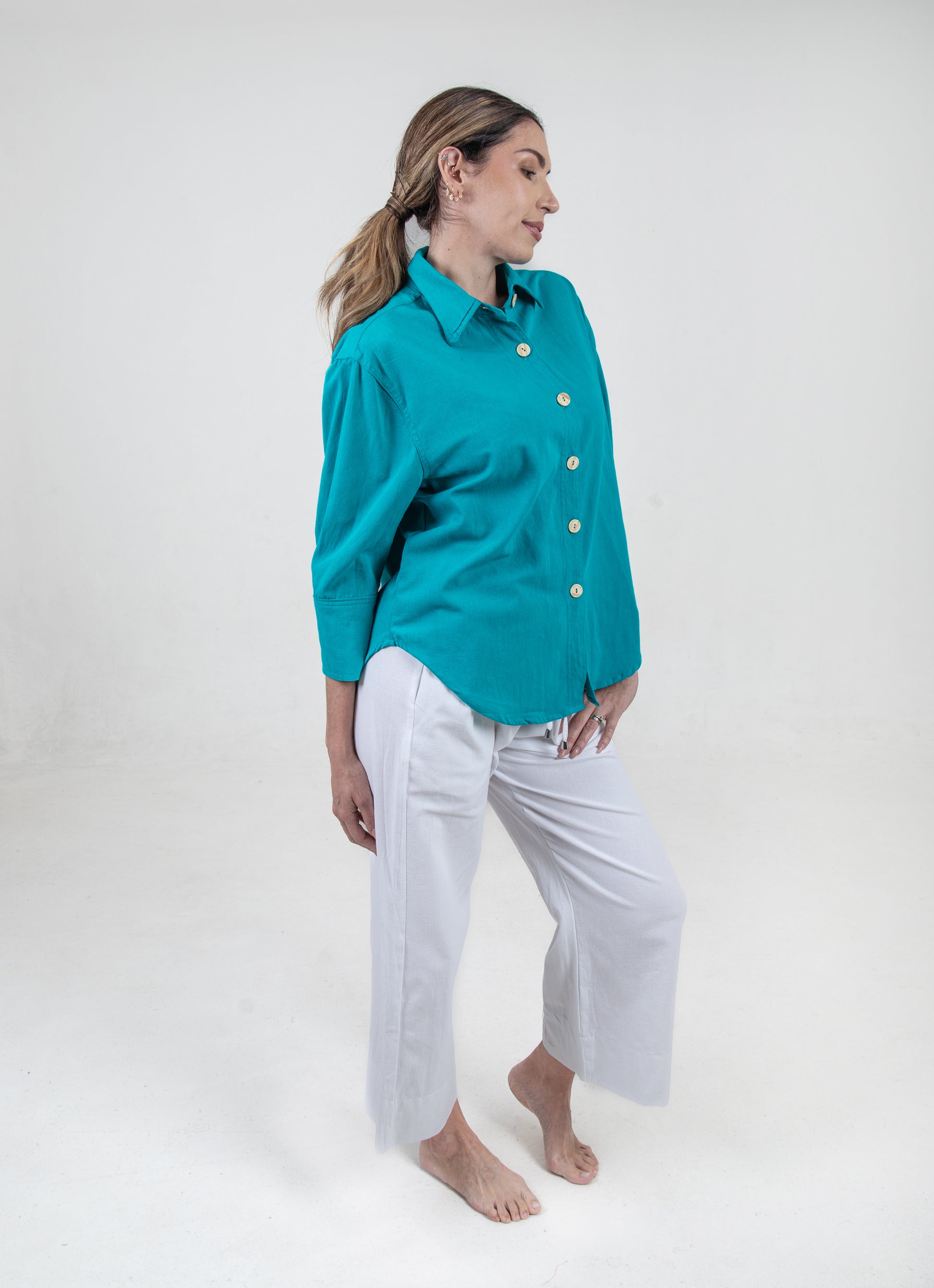 Su diseño suelto, con botones al frente y cuello clásico, te da libertad de movimiento y un estilo relajado, sin perder elegancia. Ideal para llevarla abierta como sobrecamisa, fajada o suelta, según tu mood.