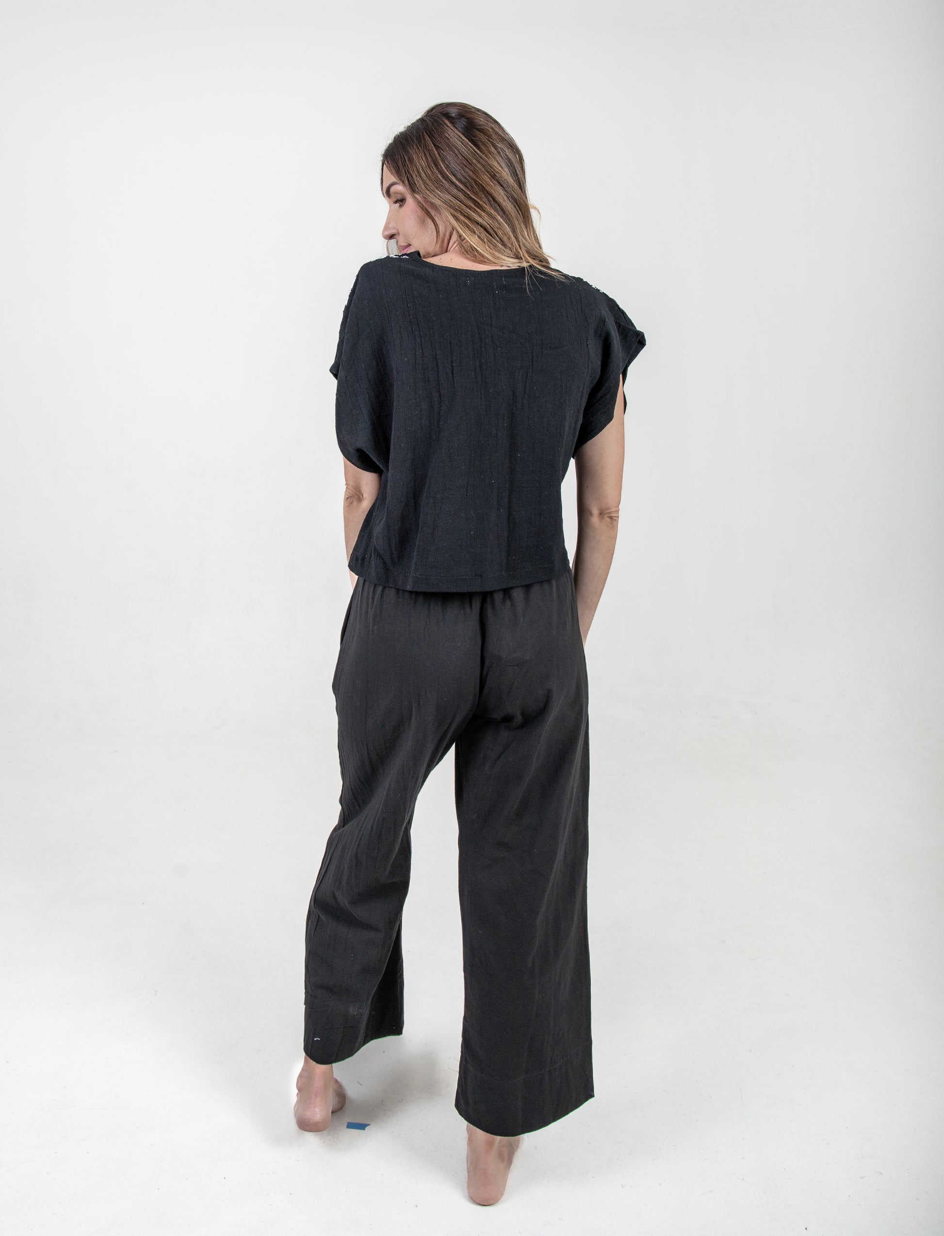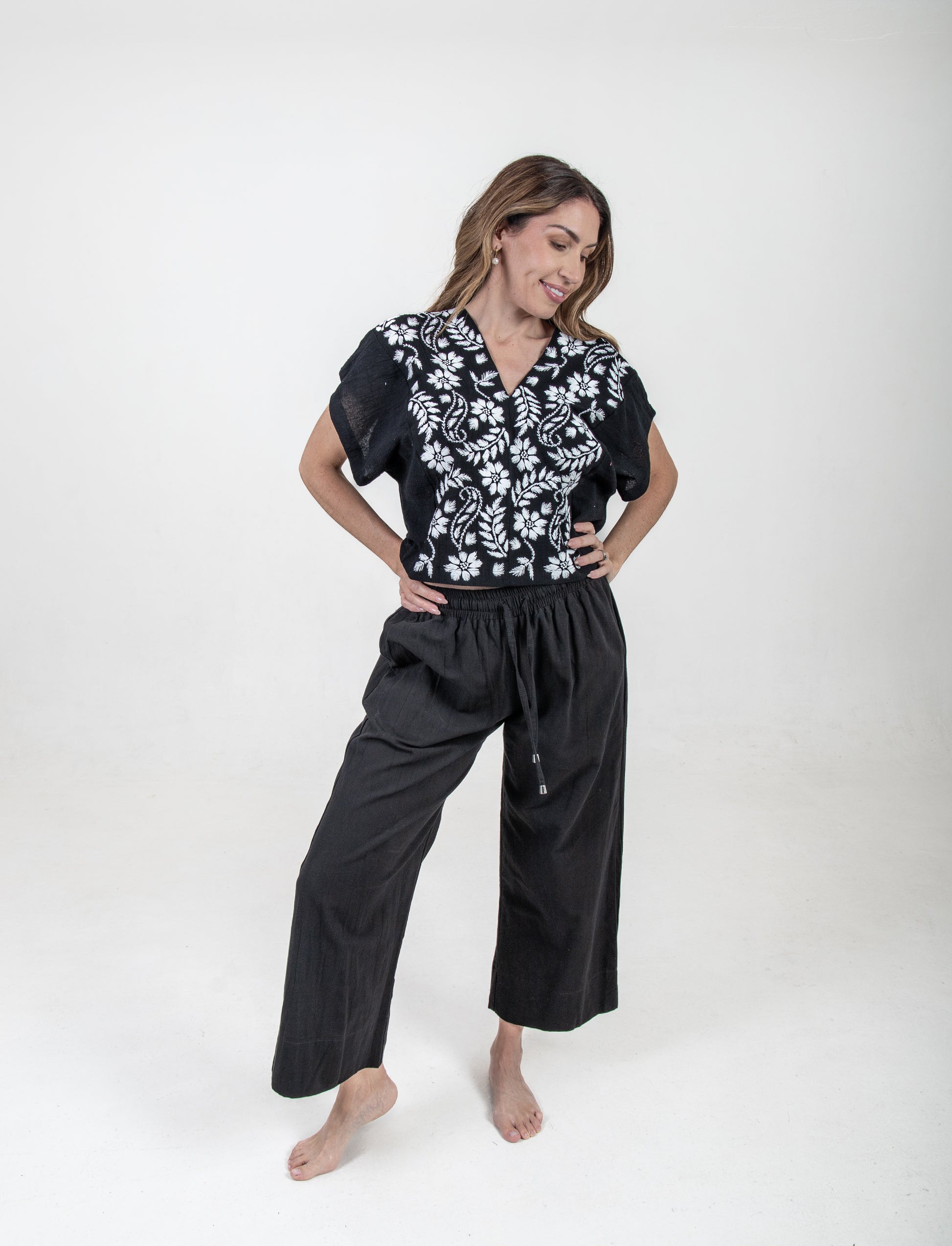 Este crop top es una de esas piezas que combinan con todo y elevan cualquier look. Está hecho 100% en manta de algodón, lo que lo hace ligero, suave y perfecto para climas cálidos o para llevar en capas durante todo el año.