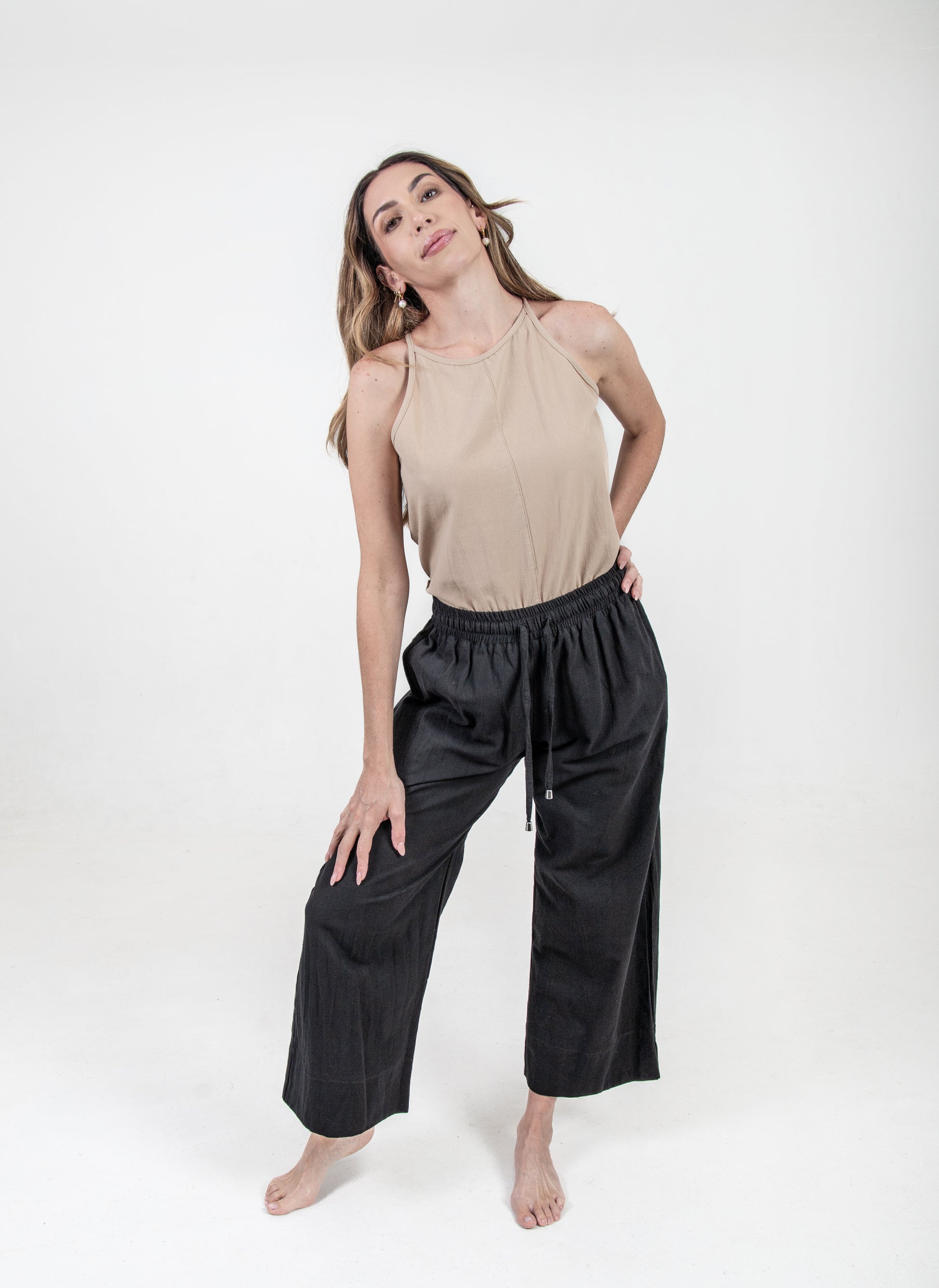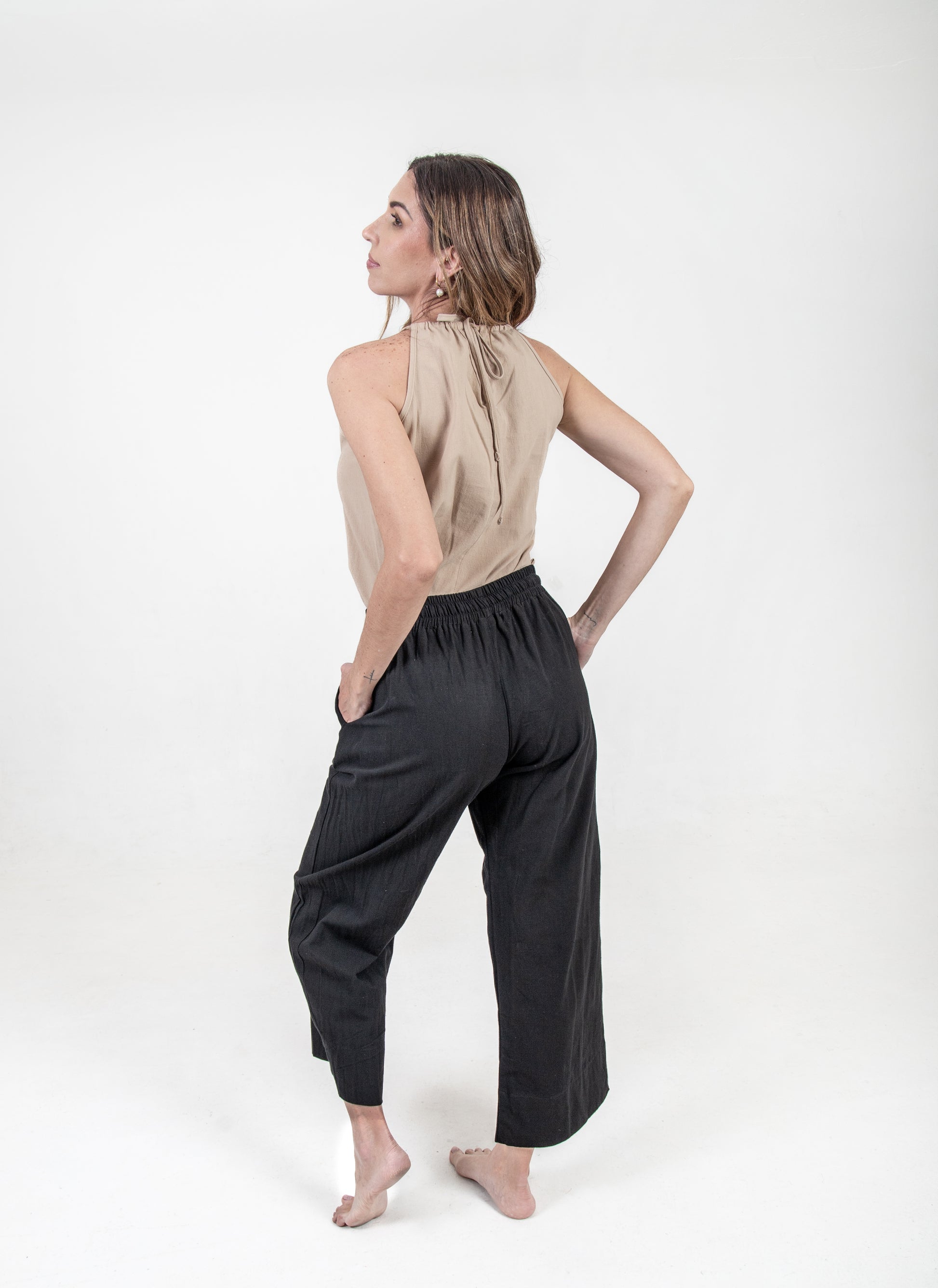 Este pantalón está confeccionado en manta, una tela natural que combina la resistencia de un buen básico con la frescura que necesitas en tu día a día.