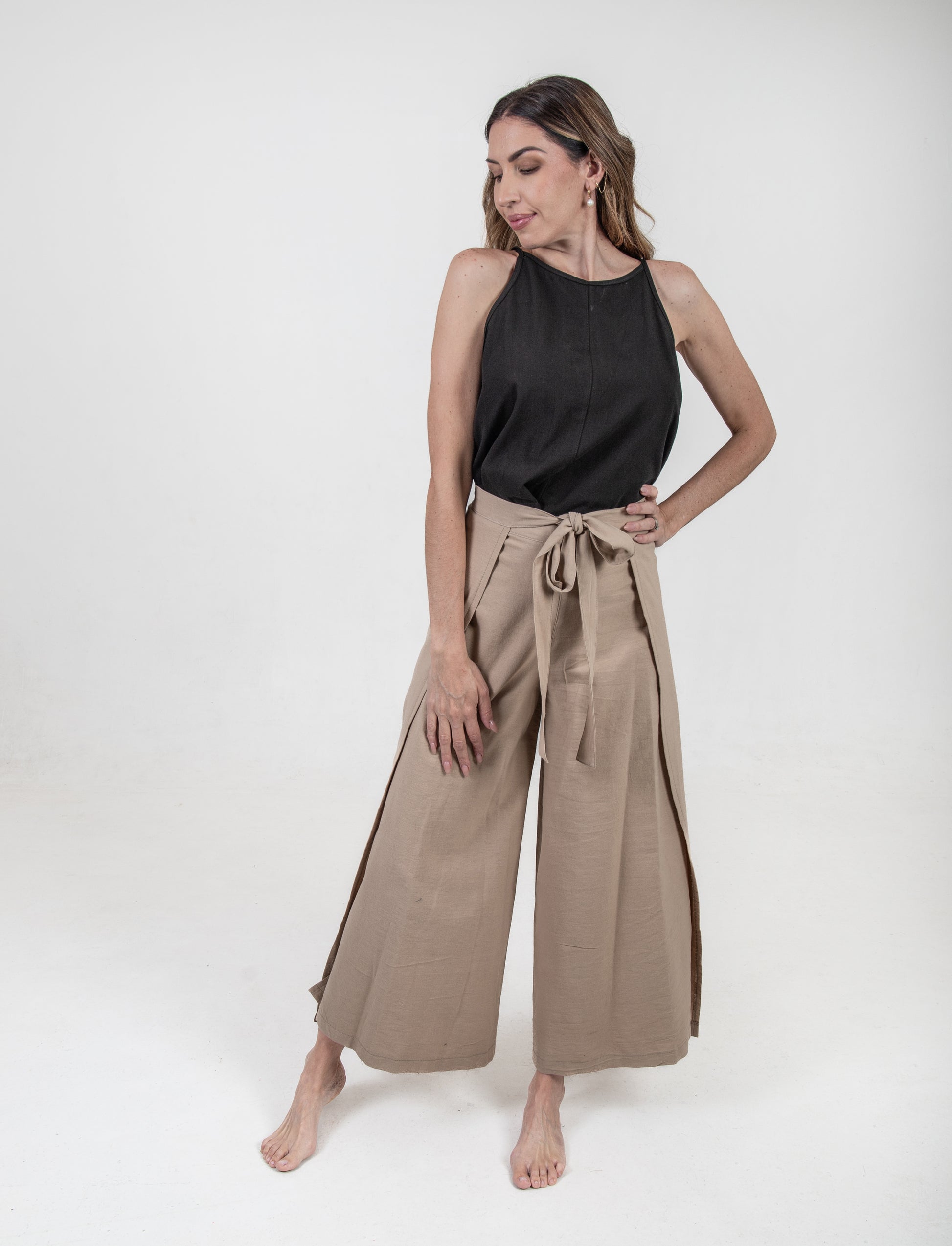 Este pantalón está elaborado en manta de algodón, una tela natural, suave y fresca que se adapta con fluidez a tu cuerpo. Su diseño cruzado tipo pareo con amarre lateral te permite ajustarlo a tu medida, brindando una silueta favorecedora sin apretar.