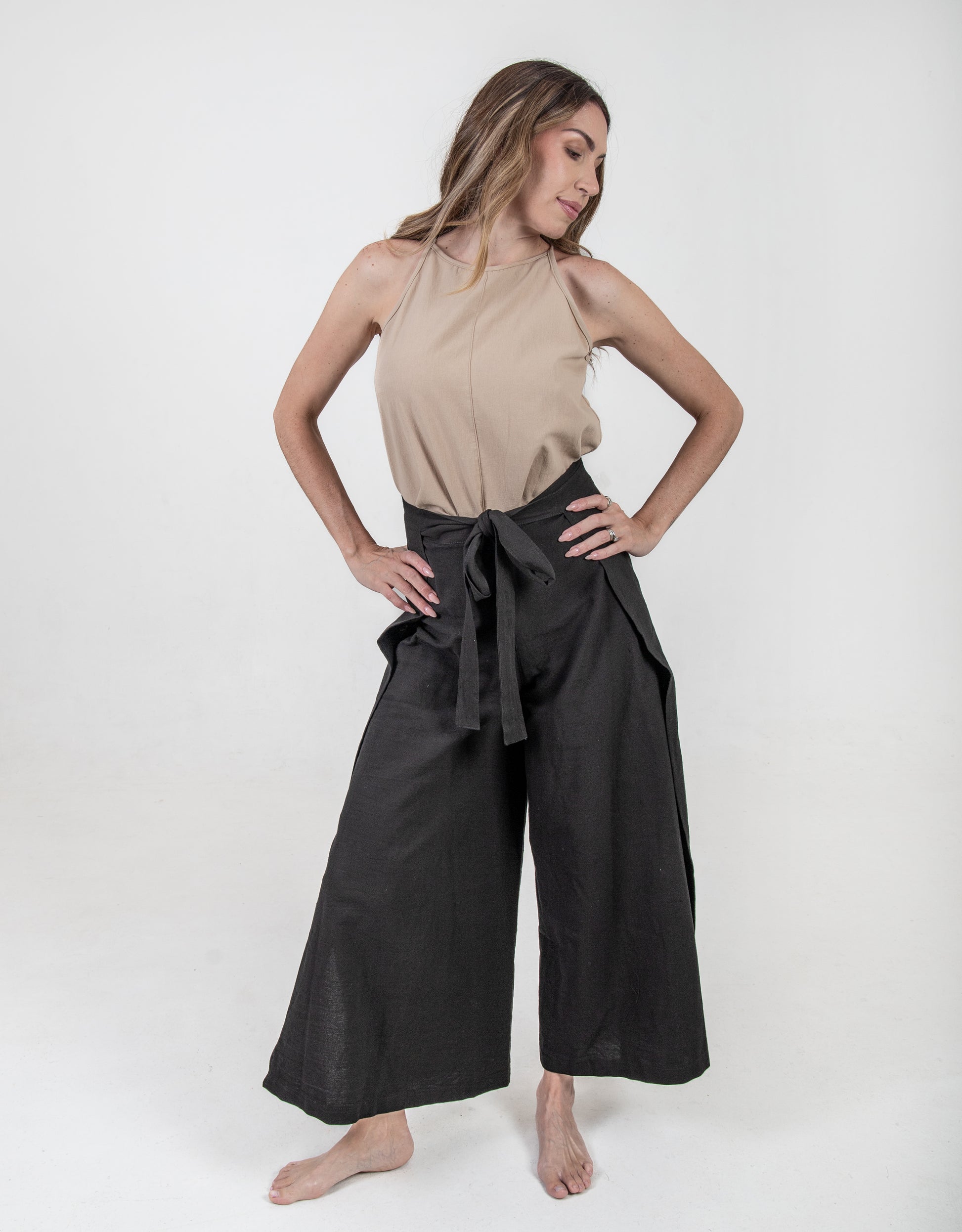 Este pantalón está elaborado en manta de algodón, una tela natural, suave y fresca que se adapta con fluidez a tu cuerpo. Su diseño cruzado tipo pareo con amarre lateral te permite ajustarlo a tu medida, brindando una silueta favorecedora sin apretar.
