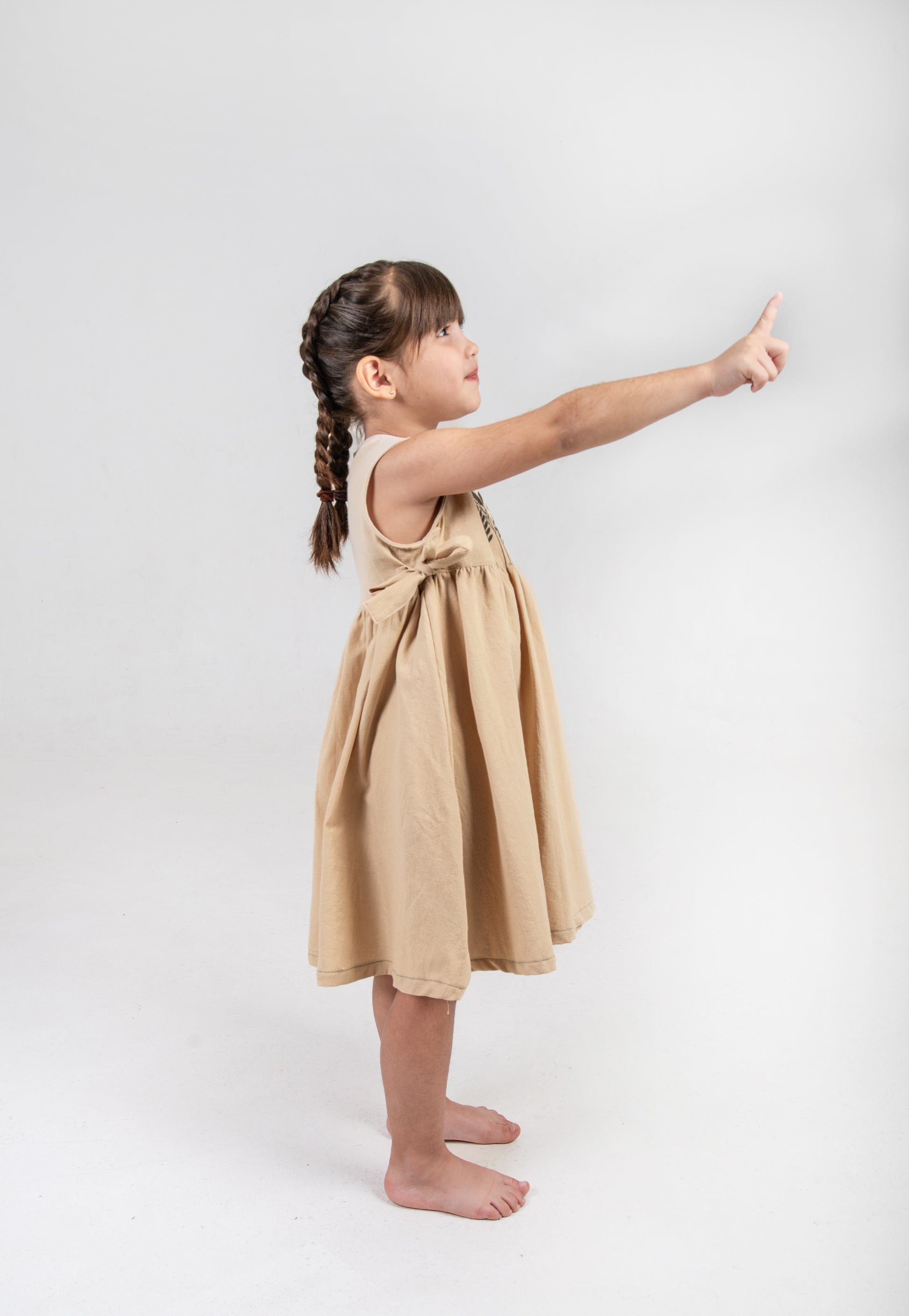 Este vestido para niña está confeccionado en manta de algodón, una tela suave y fresca ideal para los días de calor. Su diseño relajado y cómodo permite total libertad de movimiento, mientras que el estampado en serigrafía aporta un toque de diversión y personalidad.