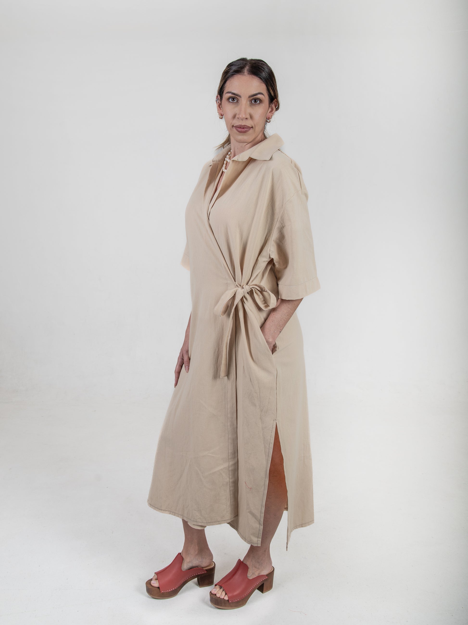 Este vestido está confeccionado en manta con acabado tipo mezclilla: una tela natural, suave y con estructura, ideal para quienes buscan estilo sin sacrificar comodidad. Su diseño cruzado con amarre ajustable realza la silueta y se adapta fácilmente a distintos tipos de cuerpo.